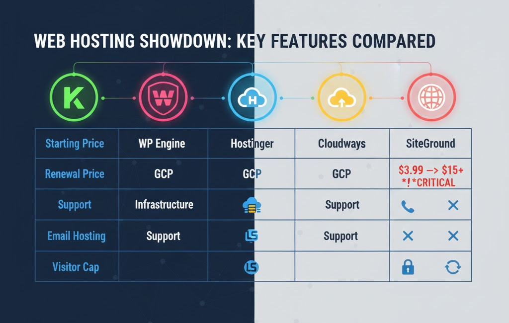 At Core Rated, we stripped away the marketing claims and put the five industry leaders—Kinsta, WP Engine, Hostinger, SiteGround, and Cloudways—to the ultimate test. This definitive comparison breaks down the most critical factors: initial cost vs. renewal shock, speed benchmarks, support quality, and feature-set.